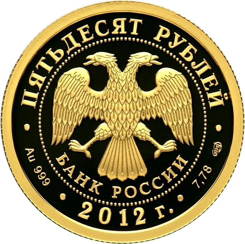 Center: Bank of Russia emblem (two-headed eagle, wings down, with "БАНК РОССИИ" below), within a dotted circle. Rim inscriptions: top - "ПЯТЬДЕСЯТ РУБЛЕЙ"; bottom left - metal and fineness; center - "2012 г."; bottom right - metal content and mint mark.