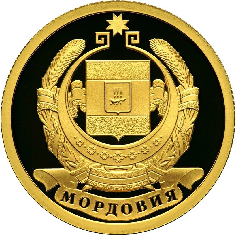 Central relief of Mordovia's coat of arms, with "МОРДОВИЯ" inscribed on a ribbon below.