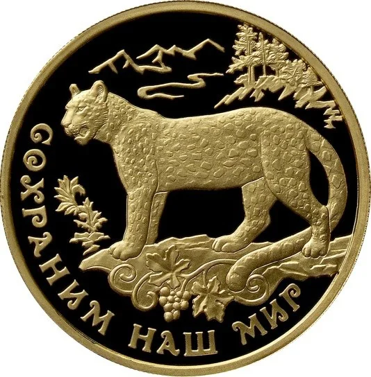 A standing leopard watches left on a disc, with trees to the right, distant mountains to the left, and "СОХРАНИМ НАШ МИР" along the bottom rim.