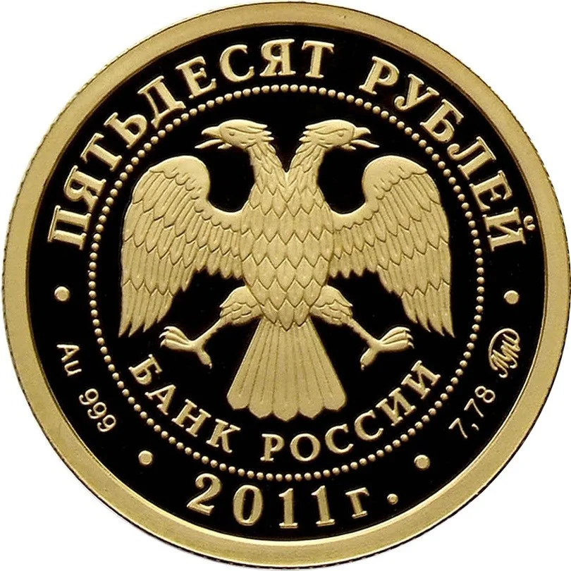 Center: Bank of Russia emblem (two-headed eagle, wings down, with "БАНК РОССИИ" below) inside a dotted circle. Rim inscriptions: top - "ПЯТЬДЕСЯТ РУБЛЕЙ"; bottom left - metal and fineness; center - "2011 г."; bottom right - metal content and mint mark.