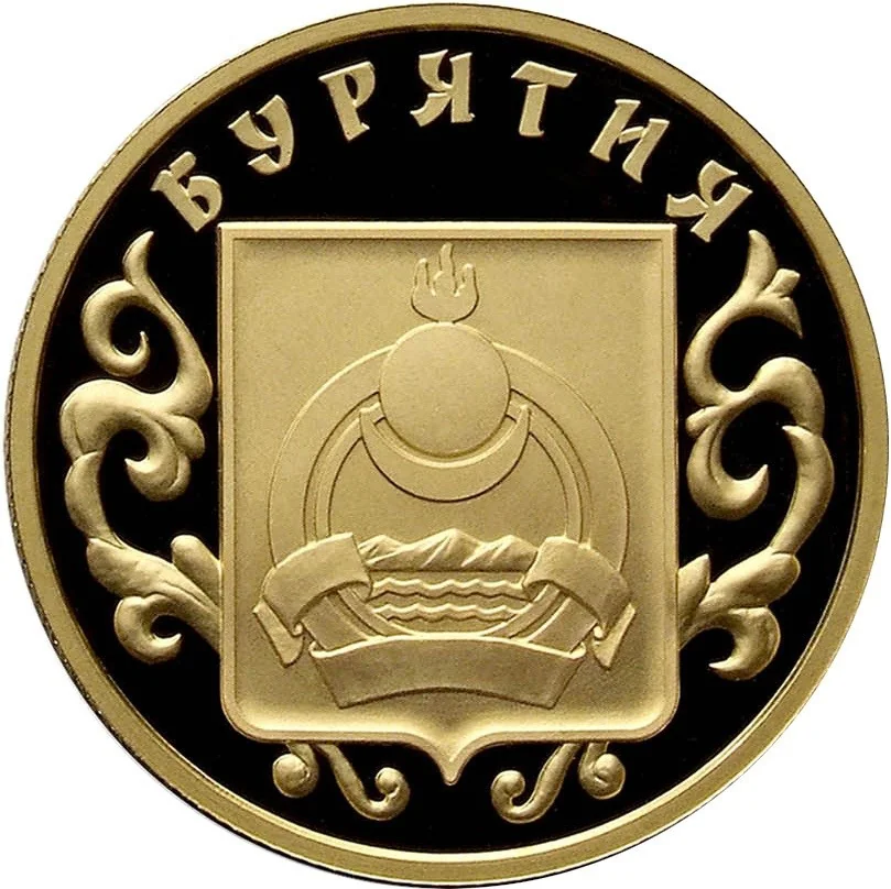 Center: Republic of Buryatiya's coat of arms in relief, flanked by national ornamental elements. Rim inscription: "БУРЯТИЯ" (BURYATIYA).