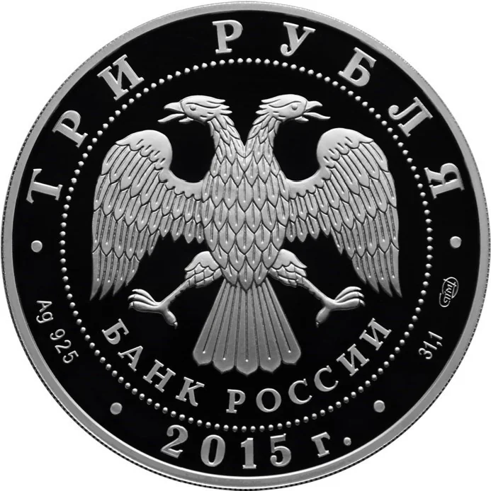 Center: Bank of Russia emblem (two-headed eagle, "БАНК РОССИИ"), circled by dots. Rim inscriptions: top – "ТРИ РУБЛЯ"; bottom left – metal and fineness; center – "2015 г."; bottom right – metal content and mint mark.