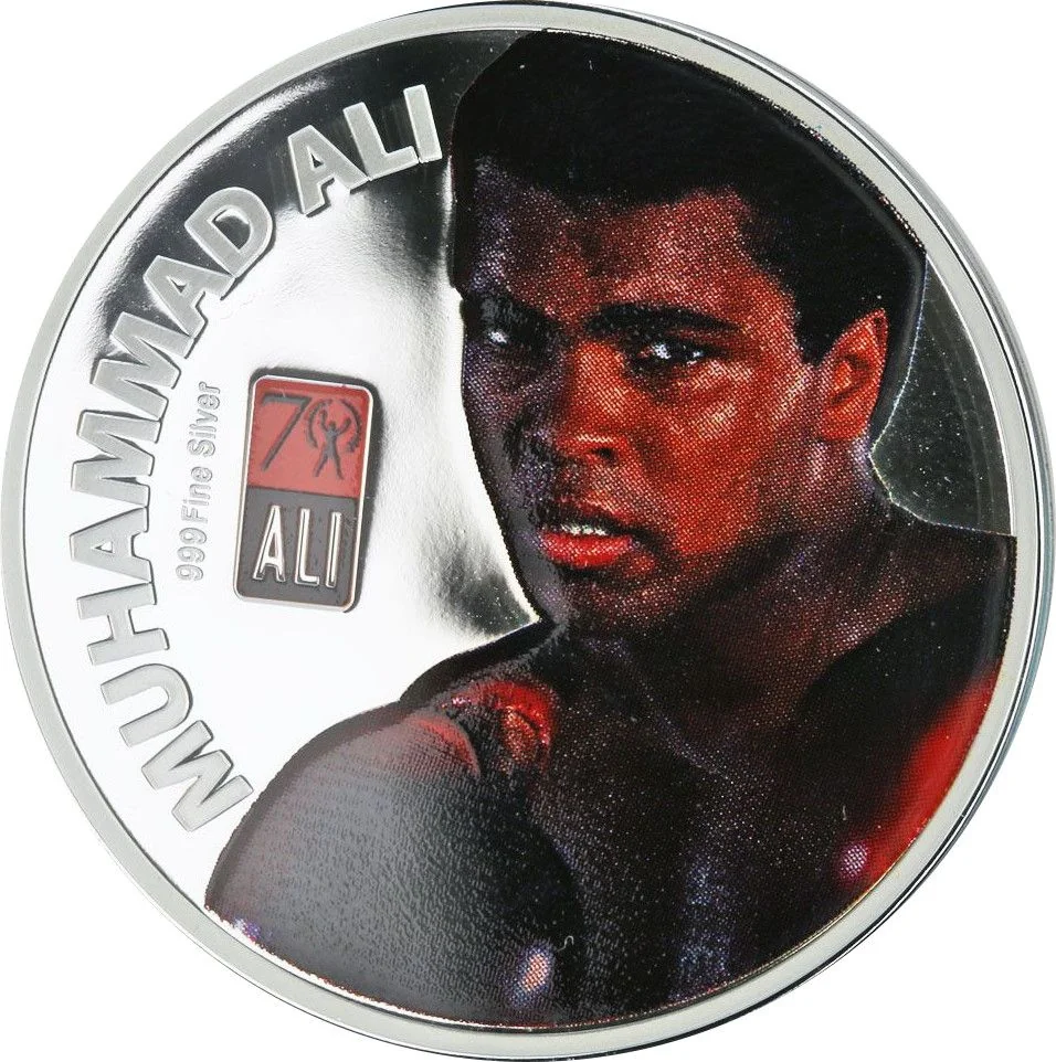 Colorized portrait of Muhammad Ali, topless with boxing gloves, facing forward. Name, silver fineness, and logo at left.