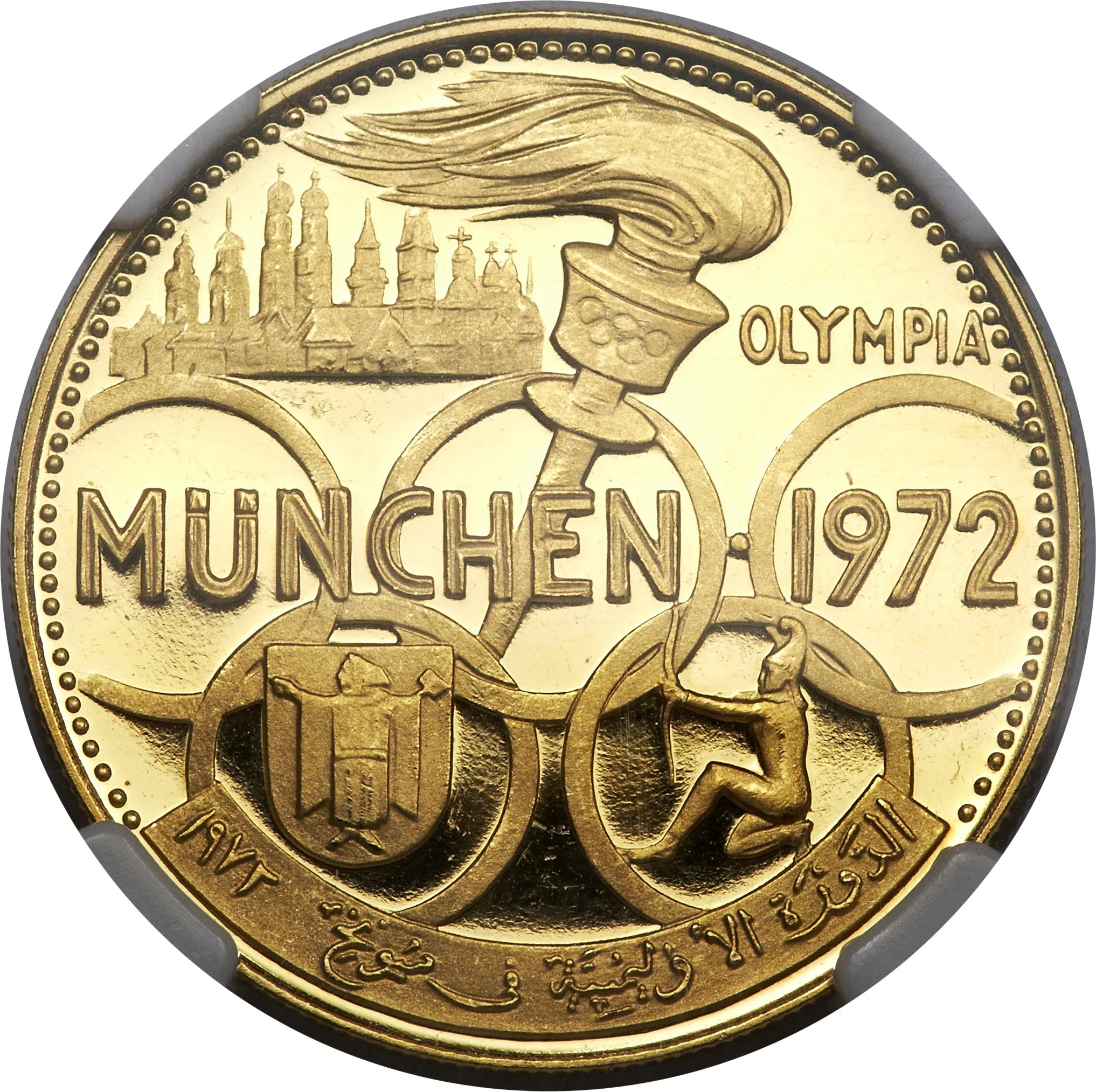 Description: Coat of Arms. Arabic "Al Fujairah" on both flags, mirrored on the right. Gold fineness in oval at bottom right.