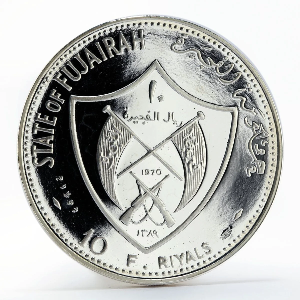 Description: Coat of Arms with "Al Fujairah" in Arabic on both flags—standard on the left, mirrored on the right. Mintage figure at lower left, silver fineness in oval at lower right.