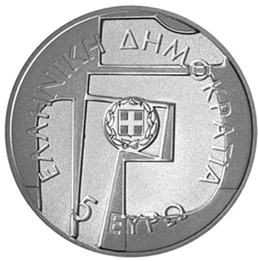 The coin centers on the National Crest, encircled by "Hellenic Republic" in Greek, with "5 EURO" below. The background features a detail from a Yannis Moralis painting.