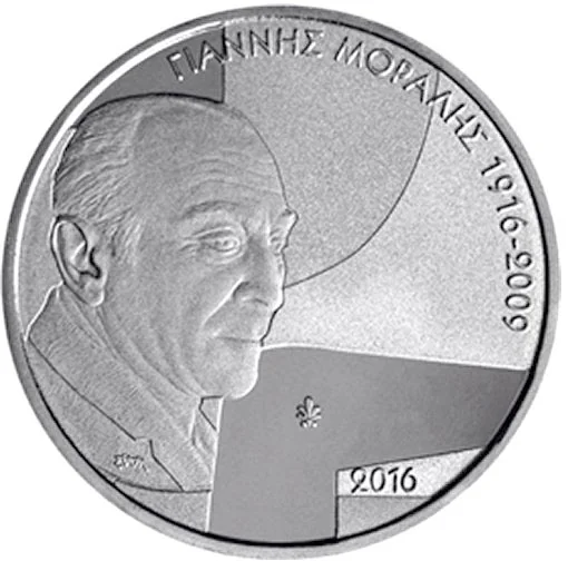 The coin depicts an older Yannis Moralis with one of his paintings in the background. The outer ring bears his name, life dates "1916-2009", the issue year "2016", and the Greek Mint's palmette symbol.