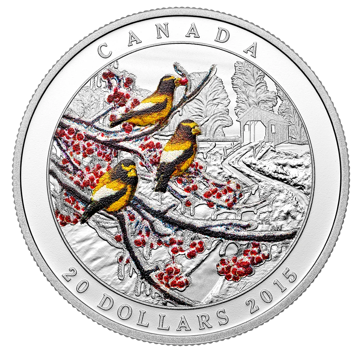 Three evening grosbeaks perch on a frozen cherry tree, overlooking a snowy landscape and a distant covered bridge.
