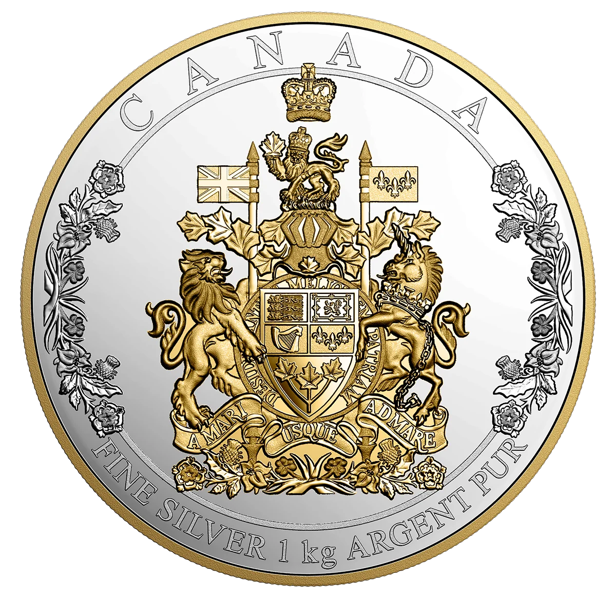 Gilded Canadian coat of arms, metal weight and fineness below.
