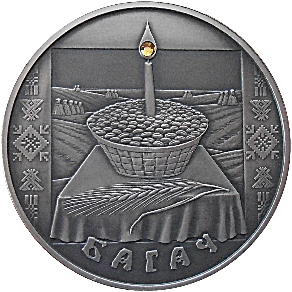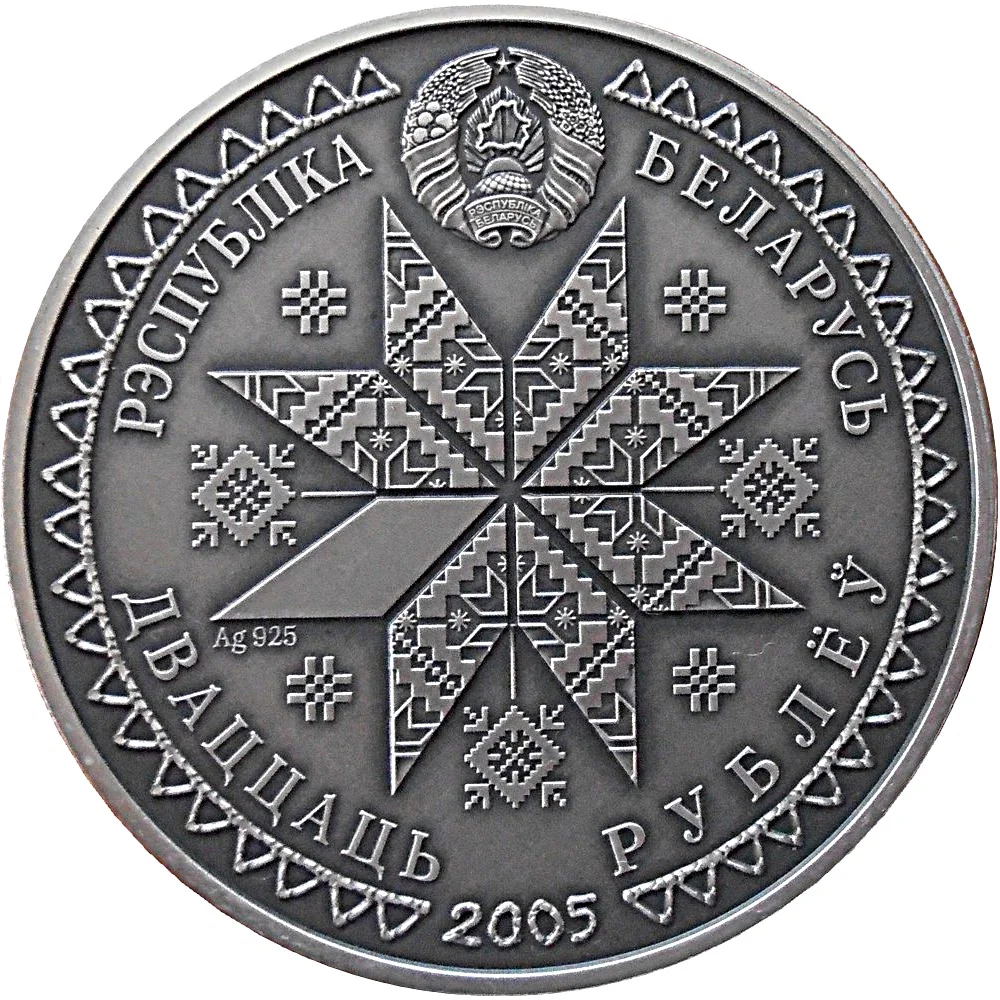 Description: The circular ornament features the relief of the State Coat of Arms. At its center is a solar sign—an octagonal figure with rhombic decor representing rays. Below is the year of issue. The rim is inscribed: "РЭСПУБЛІКА БЕЛАРУСЬ" (REPUBLIC OF BELARUS) above and "ДВАЦЦАЦЬ РУБЛЁЎ" (TWENTY ROUBLES) below.