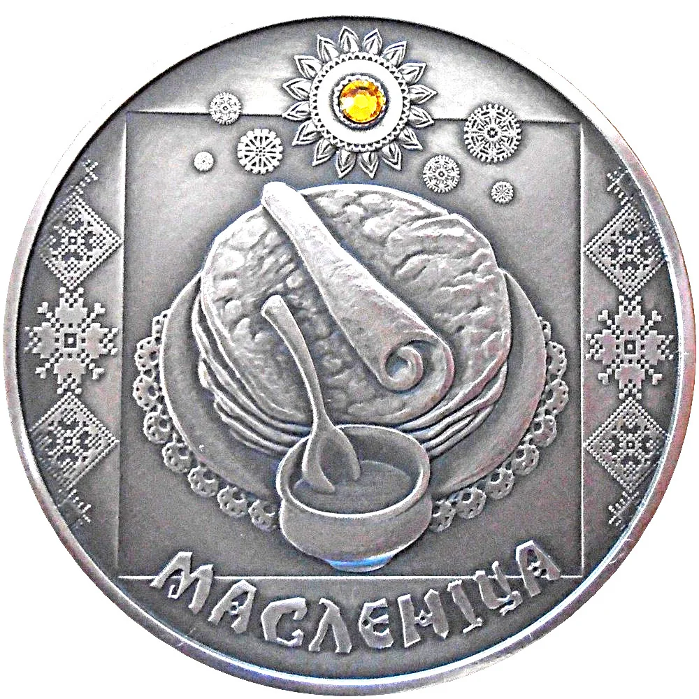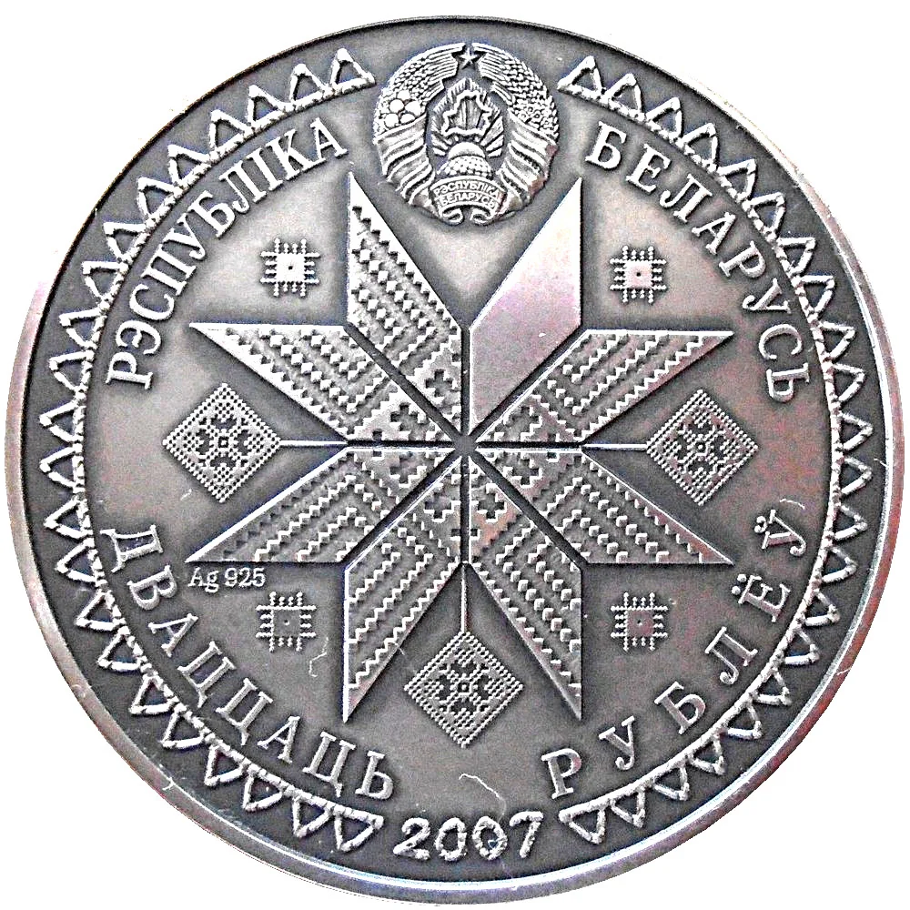 Description: A relief image of the State Coat of Arms of Belarus within a circle, surrounded by a geometric ornament. The center features a solar sign—an octagonal pattern with decorative rays. Below is the year of issue, with circumferential inscriptions: "РЭСПУБЛИКА БЕЛАРУСЬ" (THE REPUBLIC OF BELARUS) above.
