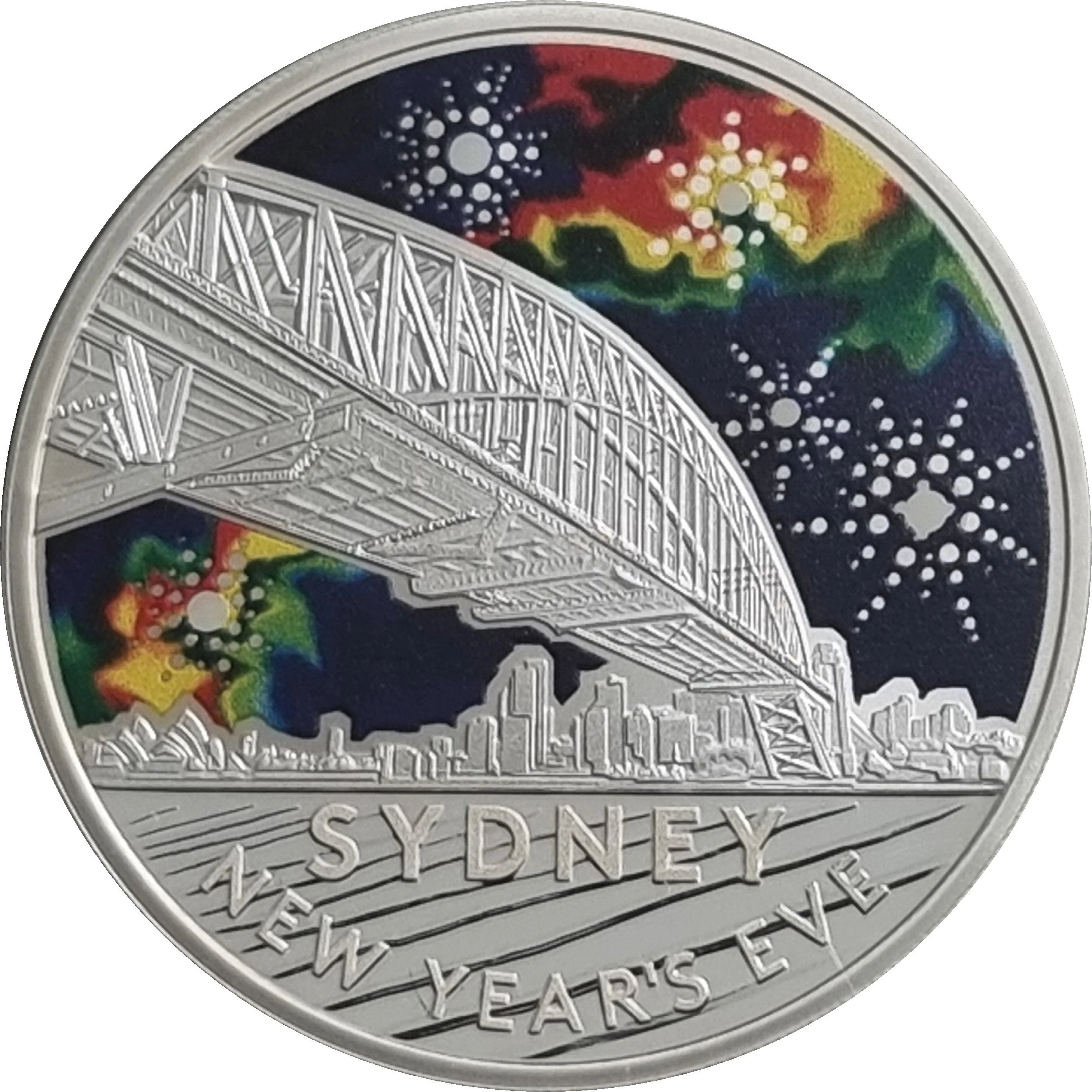 Colourful NYE fireworks over Sydney Harbour Bridge.