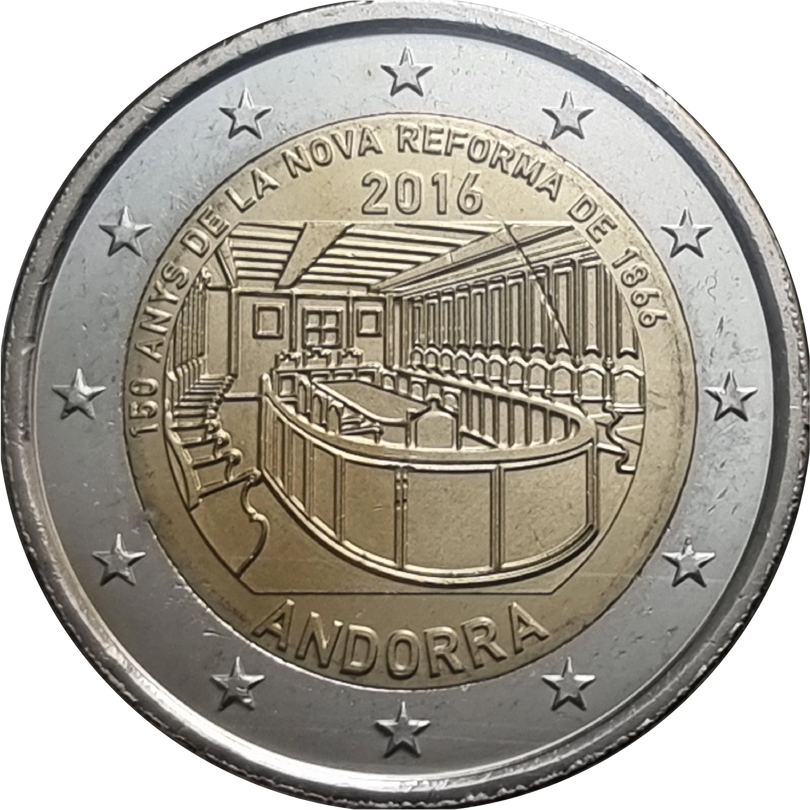Description: Assembly hall of Andorra's Parliament, the Casa de la Vall. The coin's outer ring features the twelve stars of the European flag.
